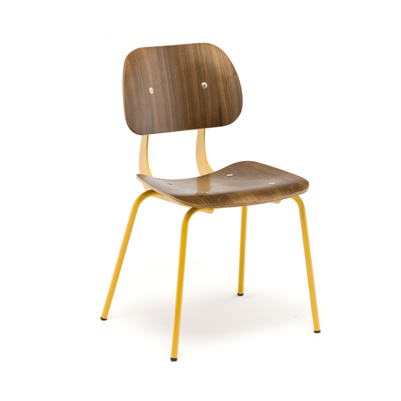 Gold Apple furniture factory manufactures industrial dining chair with bentwood seat and back. A lovely complement to any dining room table or office, this modern metal chair has curved plywood seat and back. Plywood seat and back offers an ergonomic curve to promote comfort. The Walnut laminate finish delivers maximum durability and allows easy cleaning. Metal frame with powder-coated steel legs includes nonmarring floor glides to protect your floors. They’re connected to a light, streamlined steel frame, which shows to a modern look, It is a popular dining room chair, office chair, and restaurant and cafe chair.